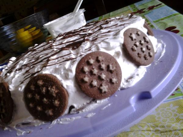 Togliete la cerniera dalla torta pan di stelle e ricoprite di panna.