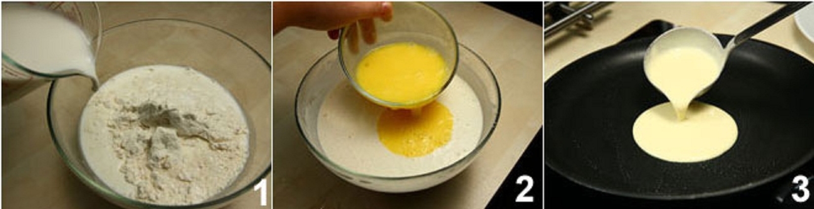 Preparate l’impasto delle crepes ponendo in una ciotola dai bordi alti la farina, la vanillina, il latte e il sale (1), e mescolando tutti gli ingredienti con uno sbattitore o un minipimer. In una terrina a parte, sbattete le uova e poi, sempre sbattendo, incorporatele al composto di latte (2). Lasciate riposare la pastella coperta almeno mezz’ora. Sciogliete il burro in un tegamino e incorporatelo all’impasto, amalgamandolo bene, poi ponete una padella antiaderente per crepes sul fuoco e fatela scaldare, quindi versate al centro di essa un mestolo di impasto (3) (regolatevi in base alla grandezza della padella che userete)