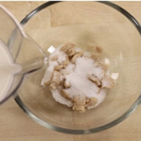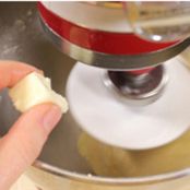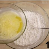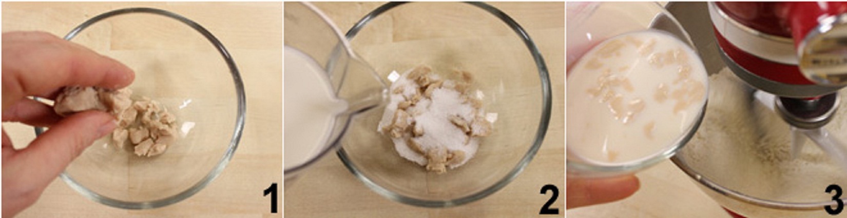 Per preparare i donuts iniziate sbriciolando il lievito di birra in una ciotolina (1) e aggiungendo un cucchiaino di zucchero preso dal quantitativo presente nella ricetta. Aggiungete poco latte tiepido (2) (preso dai 250 ml ) e mescolate per sciogliere il tutto. Versate i due tipi di farina nella tazza di una planetaria munita di foglia e aggiungete mano a mano il composto di lievito (3),