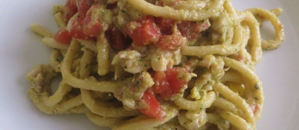 Vi propongo un piatto di spaghetti con un pesto di Carcioghiotto Ponti e triglie, arricchito e profumato da una dadolata di pomodori profumati con l’aceto balsamico di Modena. Buon appetito.