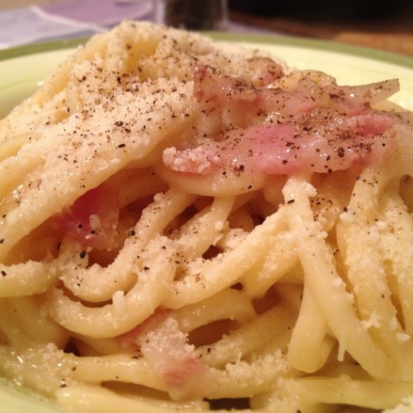 Conditeli in una ciotola da portata con il soffritto al guanciale e abbondante pepe macinato al momento quindi amalgamate energicamente.