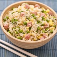 Nella padella dove c'è la cipolla aggiungiamo il riso lesso, i piselli e la frittata tagliata a cubetti. Saltiamo, aggiungendo ancora olio extravergine di oliva e aceto balsamico. Aggiustiamo di sale, se occorre. Serviamo caldo ma teniamo conto che il riso alla cantonese è buono anche freddo