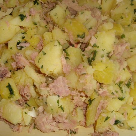 Disponete le patate in un piatto, condirle con l'olio, un pizzico di sale, il prezzemolo tritato e l'aglio spellato ed affettato.
