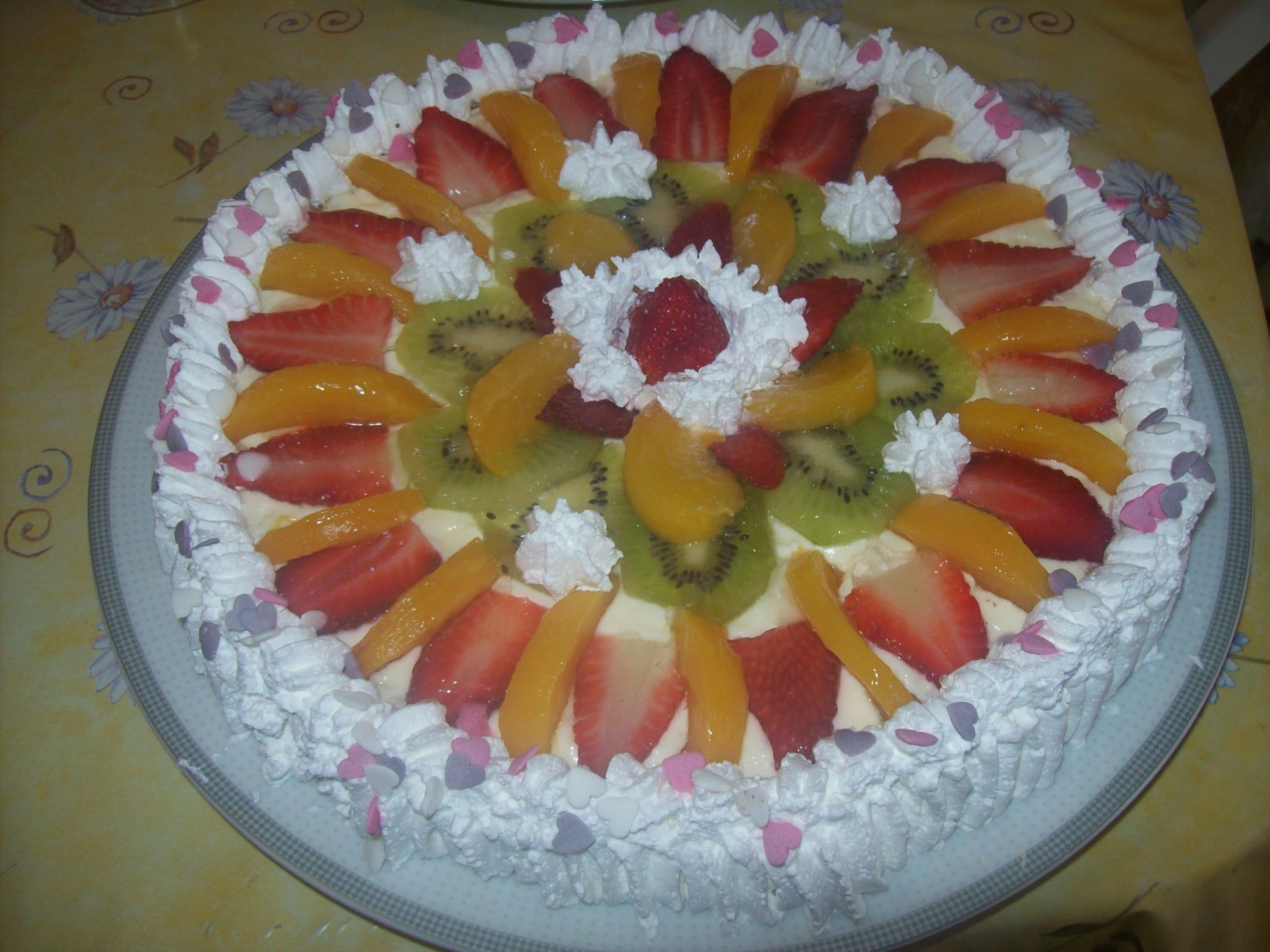 dopo sistemare la frutta fresca a proprio piacimento .In fine decorare con la panna montata nei bordi.Mettere in frigo per 30 min prima di servire
