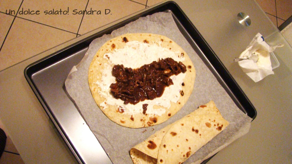 Prendiamo le piadine, ci spalmiamo su una bella noce di crescenza (qui andiamo ad occhio), ci mettiamo su la carne con tutto il suo sugo e chiudiamo a rotolo (oppure a mezzaluna…vedete voi!).