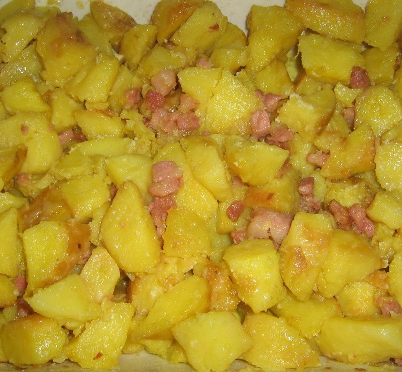 Lavate le patate e lessatele in acqua bollente salata per circa mezz'ora. Sgocciolatele, pelatele e tagliatele a tocchetti; quindi, sistematele in una pirofila da forno unta di burro.
