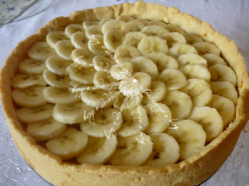 guarnire la pasta frolla, già cotta precedentemente, con la crema di banane e le rimanenti banane tagliate a rondelle. cospargere con un po' di zucchero e infornare per 5 minuti nel forno caldo e spento.