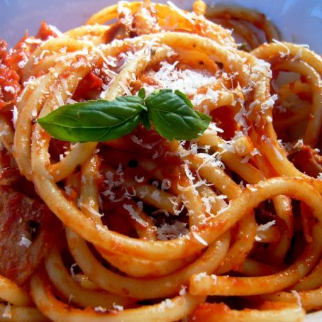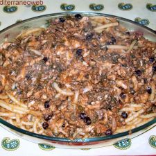 Condire la pasta con sugo, origano, capperi, mozzarella e parmigiano.