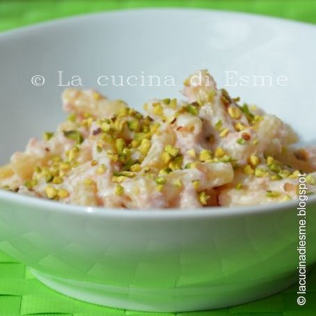 In una ciotola, che poi conterrà la pasta, stemperate il formaggio con un mestolino di acqua di cottura della pasta, aggiungete un paio di cucchiai di parmigiano grattugiato e mescolate, fino a ridurre tutto in crema. Tritate nel mixer la mortadella, unitela ai formaggi e mescolate bene. Quando la pasta sarà cotta versatela nella ciotola mescolate e spolverate con abbondanti pistacchi tritati.