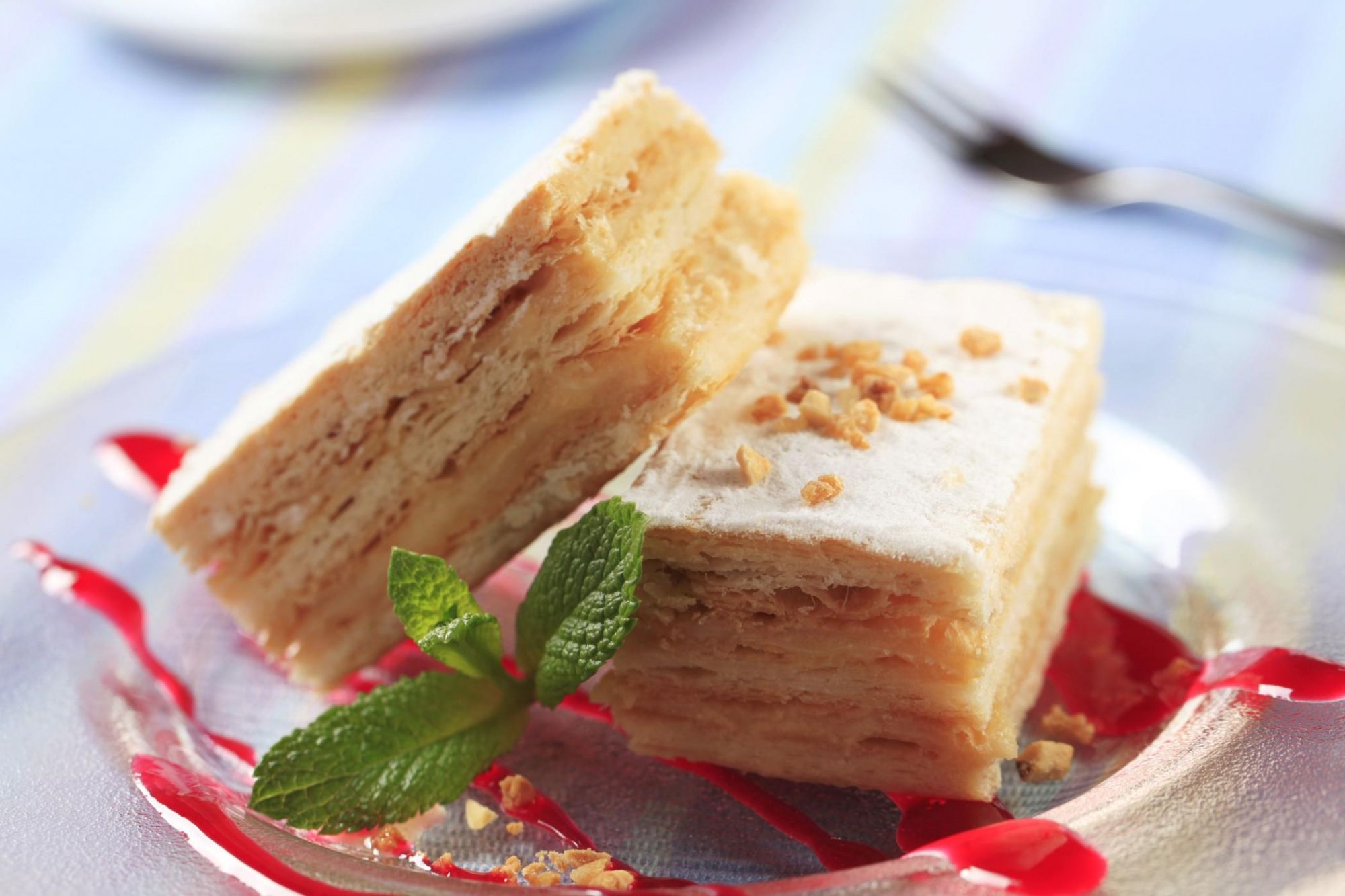 Cuocete in forno caldo a 170° i dischi di sfoglia fino a quando saranno ben gonfi. Fate bollire il latte con il baccello di vaniglia tagliato a metà. In un pentolino mescolate la farina, i tuorli, lo zucchero e aggiungete a filo il latte bollente dopo aver eliminato la vaniglia. Quando la crema si è rappresa ritiratela, fatela intipiedire e aggiungete il marsala. Tostate nel forno a 150° la granella di mandorle. Tenete da parte due cucchiai di crema. Spalmate un disco di pasta sfoglia con metà crema, sovrapponete un altro disco, ricopritelo con la restante crema, terminate con il terzo disco. Spalmate i bordi della torta con i due cucchiaini di crema tenuti da parte e fatevi aderire la granella di mandorle. Spalmate la superficie con la crema Chantilly e guarnite.