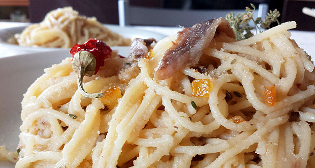 Questa è la mia personale rivisitazione degli spaghetti con alici e mollica di pane, un ottimo primo piatto proveniente dalla vecchia gastronomia del sud Italia. Gli spaghetti con alici e mollica di pane sono notoriamente un piatto povero, composto essenzialmente da ingredienti molto economici come le alici ed il peperoncino e conditi con la mollica di pane, che, a suo tempo, era utilizzata al posto del classico formaggio grattugiato, proprio perché non tutti potevano permetterselo. Oggi vi ripropongo questa buonissima ricetta, dando, però un tocco personale al piatto, arricchendolo con dell’arancia candita e del finocchietto selvatico, che ne esaltano ancora di più il sapore.