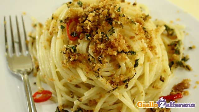Condite gli spaghetti con il composto di acciughe, peperoncino e aglio e poi buttateli nella padella contenente la mollica croccante, mischiate velocemente il tutto (per evitare che la mollica perda la sua croccantezza) e impiattate immediatamente.