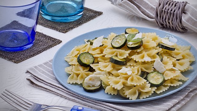 In una padella antiaderente scaldate l’olio extravergine di oliva, aggiungete lo scalogno tritato e il peperoncino privato dei semi interni e tritato e fateli appassire. Aggiungete poi le zucchine e fatele insaporire a fuoco abbastanza alto, mescolandole con delicatezza. Sfumate con il vino bianco e portatele a cottura. Nel frattempo cuocete le farfalle piuttosto al dente.