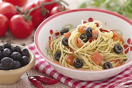 Togliete i semi all'interno e tagliateli poi a piccoli cubetti, per saperne di più sul taglio delle verdure clicca qui (come tagliare le verdure), e tenete da parte i pomodori così tagliati. Dissalate sotto l’acqua corrente le acciughe e i capperi, poi asciugateli bene; tritate grossolanamente le acciughe e tritate l'aglio e tagliate a rondelle il peperoncino fresco, privato dei semi; tritate i capperi e tagliate le olive nere a rondelle. Quindi in una padella capiente mettete a scaldare l'olio, aggiungete l'aglio tritato lasciate rosolare per un minuto aggiungete le acciughe tritate e il peperoncino lasciate insaporire, quando le acciughe cominciano a sciogliersi unite anche le olive nere tagliate