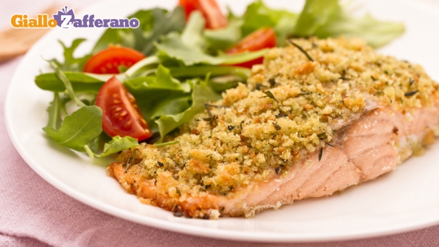 Tritate il tutto grossolanamente, ottenendo delle briciole non troppo fini. Coprite con questa panure il salmone schiacciando bene in modo da compattarla. Mettete in forno caldo a 180° per 20/25 minuti (dipenderà dalla dimensione dei pezzi). Servite il salmone immediatamente.