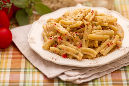 Incorporate poi il basilico lavato e asciugato, i pinoli, lo spicchio d'aglio e l’olio. Se volete mantenere un po’ di consistenza del pesto alla siciliana, potete usare il mixer ad immersione: il lavoro sarà un po’più lungo ma avrete un effetto meno cremoso, con pezzetti più visibili. In alternativa potete frullare il tutto in un mixer a bassa velocità, per controllare il grado di cremosità desiderata. Aggiustate il pesto alla siciliana con sale e pepe, poi mischiate il condimento ottenuto con le casarecce che nel frattempo avrete lessato in acqua salata e scolato molto bene al dente; servite le casarecce con pesto alla siciliana immediatamente, guarnendo il piatto con qualche foglia di basilico e qualche pinolo intero.