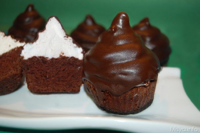 Riprendete ora i cupcakes e immergete la parte con la meringa nel cioccolato, Coprite completamente la meringa, aiutatevi con un cucchiaino se necessario.