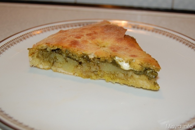 Stendere una sfoglia di 3 mm di spessore e foderare uno stampo oleato. Ricoprire con uno strato di patate bollite e aggiustare di sale