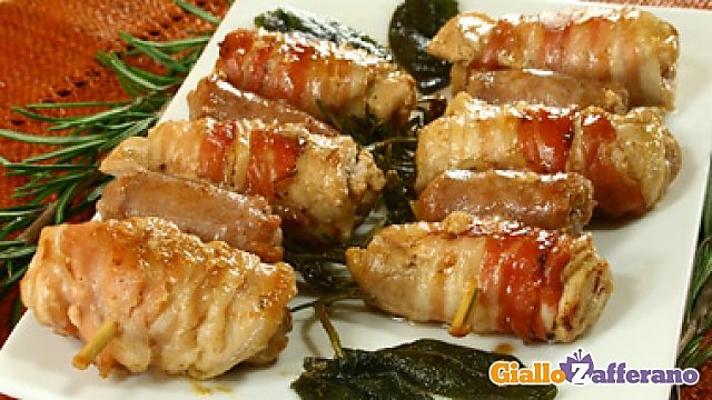 Arrotolate su ogni involtino una fetta di pancetta affumicata. Infilzate l’involtino così ottenuto su di uno spiedino di legno, infilzate poi un pezzetto di salsiccia, un altro involtino, un pezzo di salsiccia e terminate con un involtino. Preparate, procedendo in questo modo, 8 spiedini. In un tegame piuttosto largo, ponete a fondere il burro unitamente alle foglie di salvia e ai rametti di rosmarino.