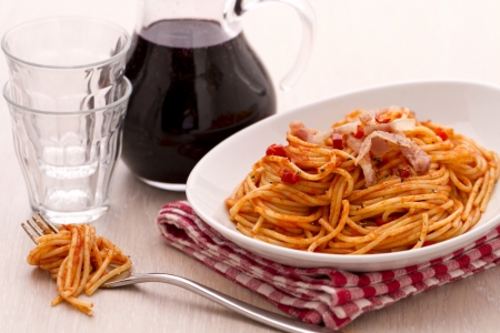 Cuocete il pomodoro fino a che diventi sfatto. Nel frattempo, cuocete gli spaghetti , scolateli e versateli direttamente nella padella, aggiungendo il guanciale, e facendoli saltare qualche istante per amalgamarsi per bene. Macinate sull'amatriciana il pepe nero e condite con abbondante pecorino grattugiato.