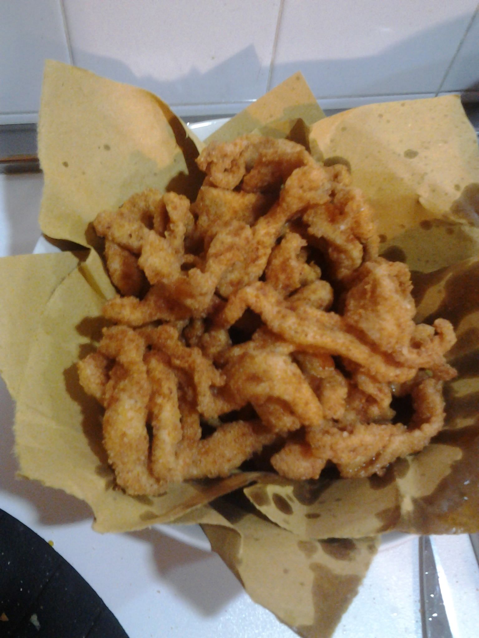 Tagliare le fettine di pollo a striscioline larghe circa 1 cm, passarle nell'uovo, nel panpesto unito a un po' da farina di polenta e paprika a piacere, buttarle in abbondante olio bollente e far cuocere qualche minuto.