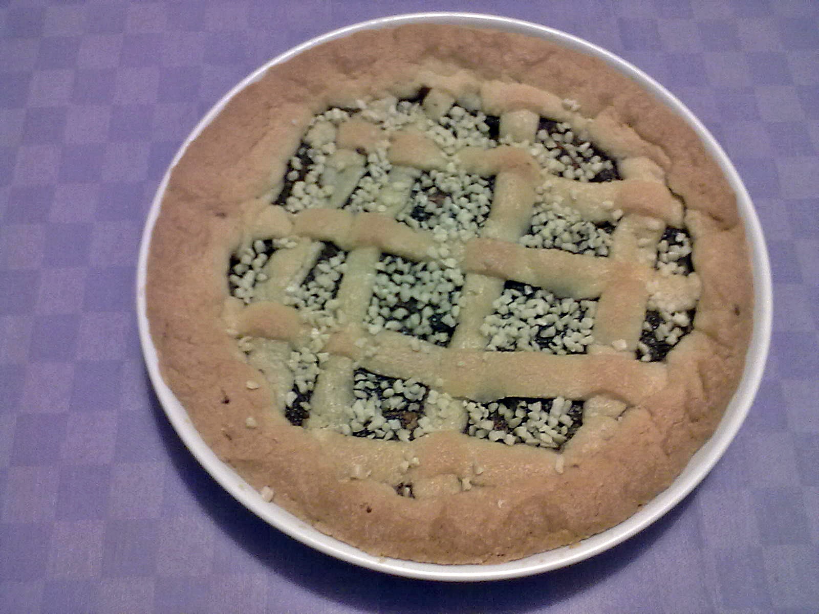 Stendere quasi 2/3 della frolla in una teglia da 24 cm di diametro tenendo i bordi un po' alti; spalmare il fondo di Nutella.