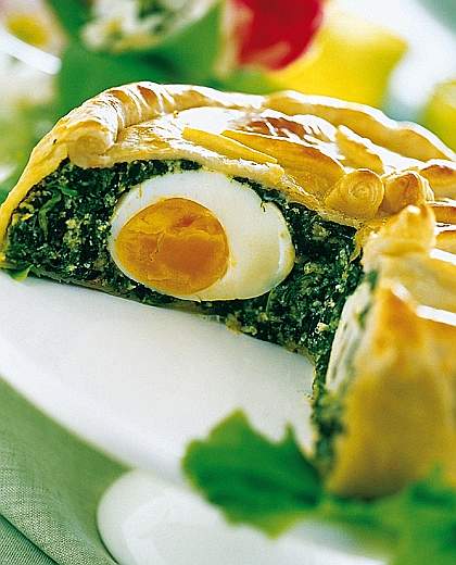 Mettete nella teglia circa metà del composto con la punta delle dita create delle cunette per sistemarci le uova, quindi tagliatele e accomodatele sul ripieno, facendo attenzione a non rompere i tuorli coprite poi con il resto del ripieno prendete il secondo foglio di pasta e coprite la torta posando il foglio sopra e poi rimboccandolo nella teglia sistemate i bordi e chiudeteli pizzicando i 2 fogli di pasta. Una volta ben chiusa incidete la superficie con la forchetta. Spennellate con il latte o con l'uovo sbattuto per lucidare e infornate a 140 gradi. Servite fredda.