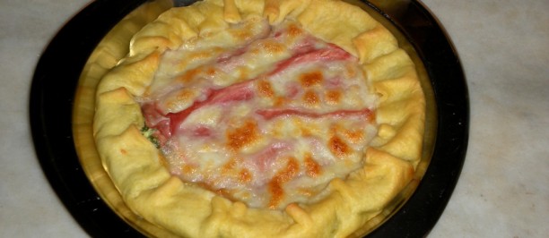 In una terrina sbattete la panna con le uova, insaporite con un pizzico di sale e di pepe e versate il composto sulla torta.