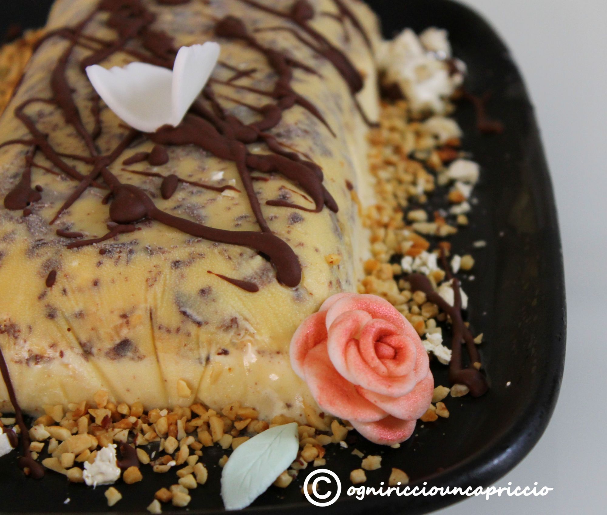 Infine versate il torrone, il cioccolato e la granella e mescolate il tutto. Suddividete negli stampini e mettete in freezer per almeno due ore. Prima di servirlo passatelo in frigo per una decina di minuti.
