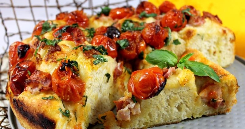 Focaccia sofficissima con pomodorini arrostiti basilico e pancetta croccante