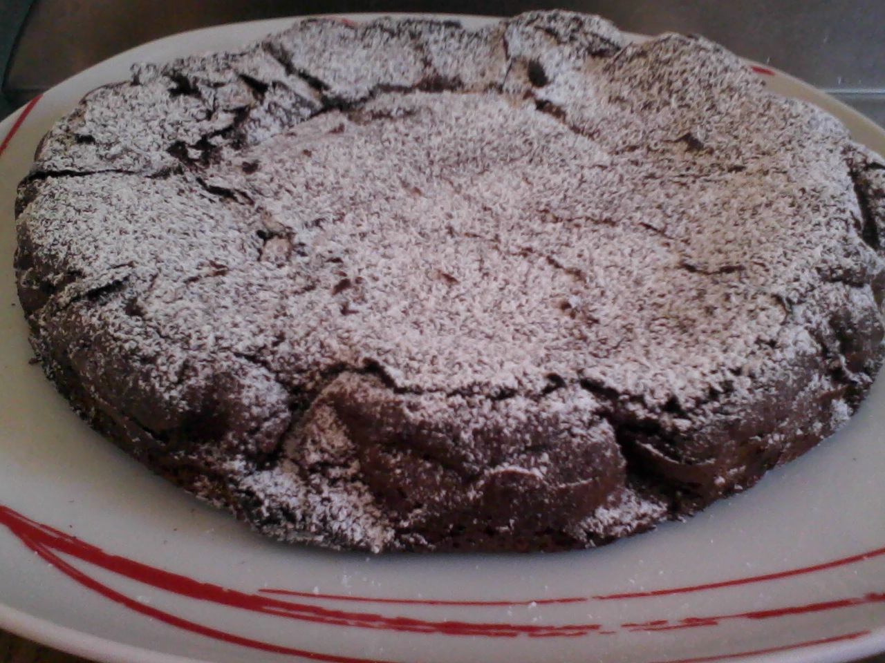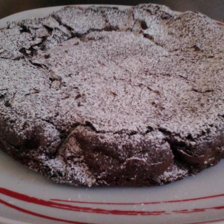 Separare le uova tenendo da parte i tuorli,montare a neve soda gli albumi e tenere in frigo.Sciogliere a fuoco basso burro e cioccolato,quando è tutto fuso unire lo zucchero,mescolare bene spegnere il fornello e unire i tuorli;mescolare un paio di minuti.Quando il composto al cioccolato è freddo unire gli albumi montati e amalgamare dal basso verso l'alto delicatamente,unire le farine setacciate e mescolare piano.Foderare una teglia(tonda diametro 26) con la carta forno,versare il composto e cuocere 180° x 25-30 min. Spolverare di zucchero a velo e servire
