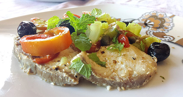 Non acquisto spesso la verdesca, ma ogni tanto due bei tranci non perdo l’occasione di portarmeli a casa. La verdesca o squalo blu, pur non essendo nobile come lo spada, è un pesce dalle carni morbide, saporite e delicate. La consistenza è simile a quella di una bistecca e si presta ad essere cucinato in molti modi. Oggi ve lo propongo in una ricetta facile e sfiziosa, con sedano, peperoni, capperi ed olive nere, con un tocco di menta fresca e semi di sesamo, il tutto sfumato in mezzo bicchiere di vino bianco. La particolarità di questa ricetta è che la verdesca, molto morbida, si contrappone perfettamente alle verdure che, saltate in padella, invece, rimangono croccanti. Se non avete mai provato la verdesca, è proprio arrivato il momento buono per farlo!