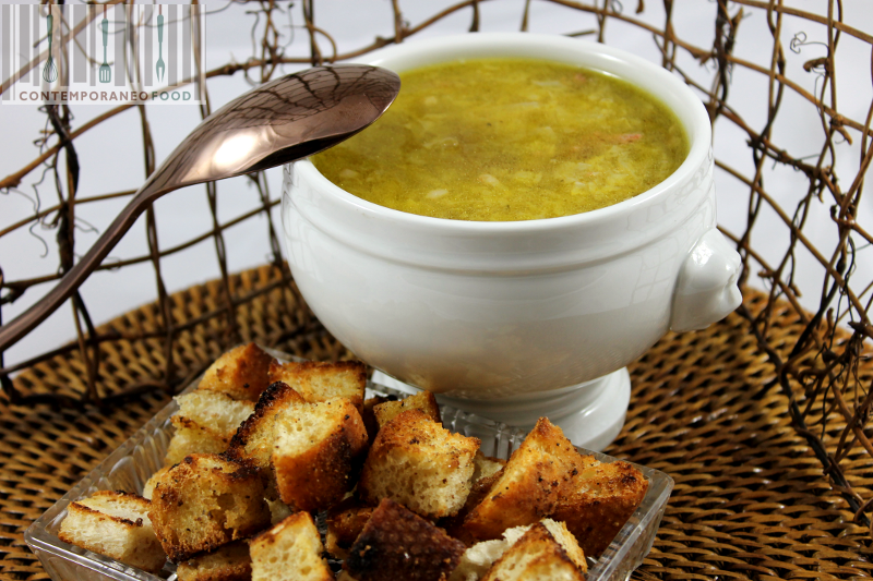 Nel frattempo preparare dei crostini a fette o meglio a piccoli cubetti facendo rosolare il pane in burro abbondante aromatizzato con uno spicchio di aglio.