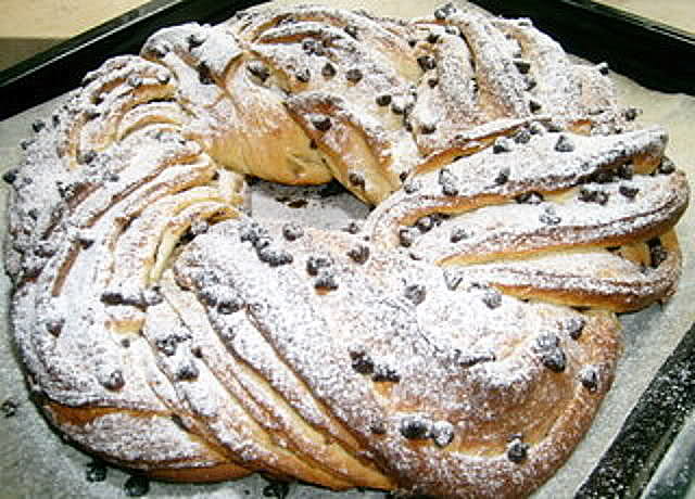 Con un coltello affilato tagliare la pasta a meta' per il verso della lunghezza ed intrecciare le due parti facendo attenzione che la parte tagliata sia rivolta verso l'esterno. Poi chiuderla ad anello e spennellare con il restante burro fuso. Mettere a lievitare per 30-40 minuti.