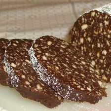 Salame a base di cacao ripieno di biscotti e ricoperto da mandorle e nocciole