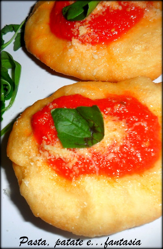 Sgonfiare l’impasto e formare delle palline irregolari, schiacciarle e friggerle in abbondante olio. Condire con un cucchiaio di sugo caldo, pecorino o parmigiano grattugiato e una foglia di basilico.