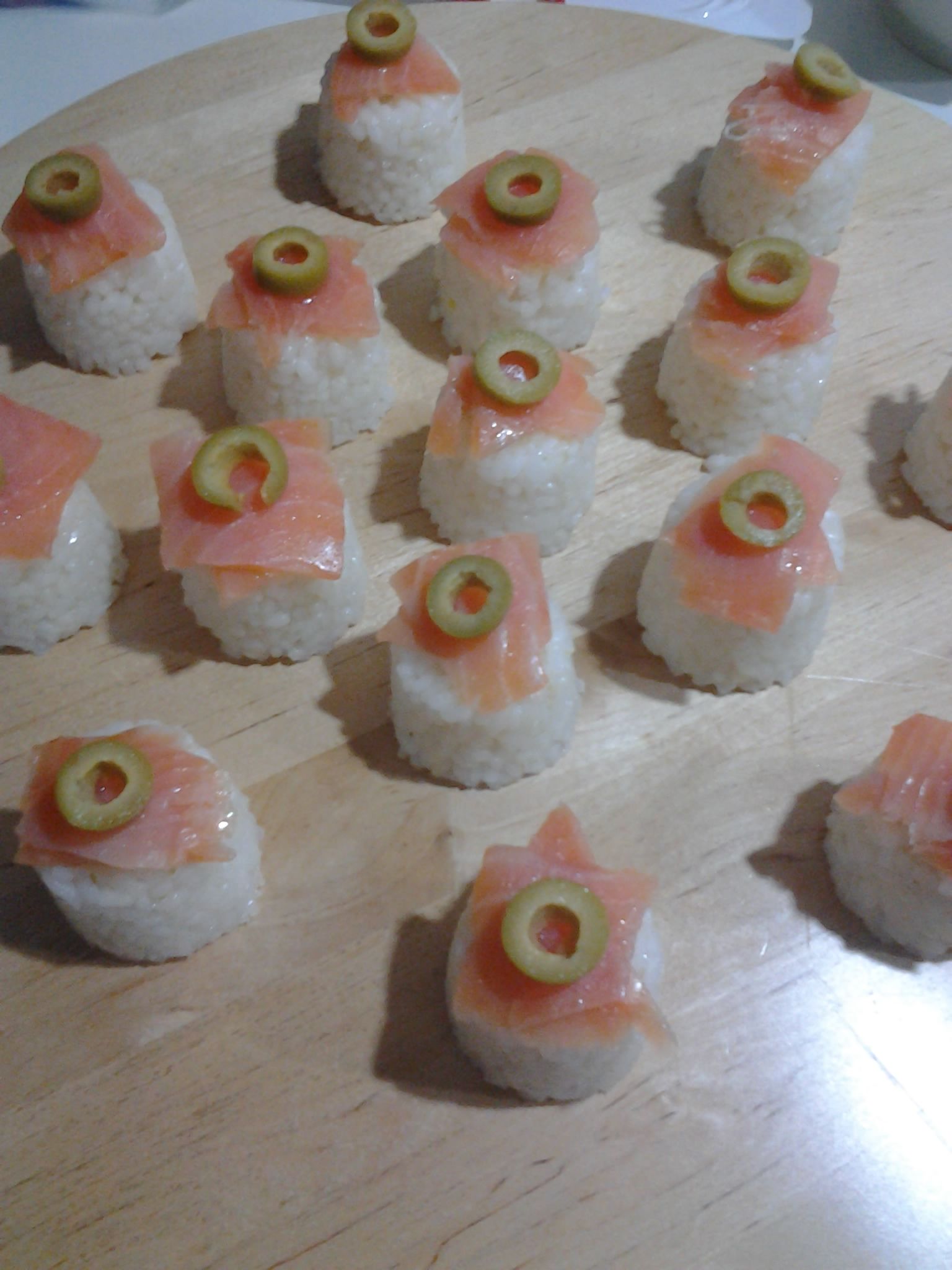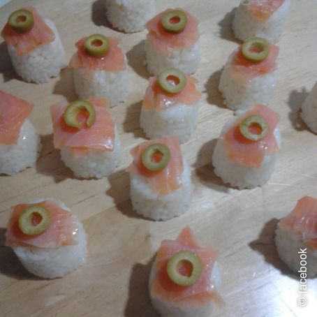 Cuocere il riso, scolarlo e condirlo con un filo d'olio per evitare che si appiccichi; formare dei cilindretti di riso utilizzando un piccolo bicchiere. Porre al di sopra di ogni bocconcino di rido qualche pezzo di salmone e un oliva.