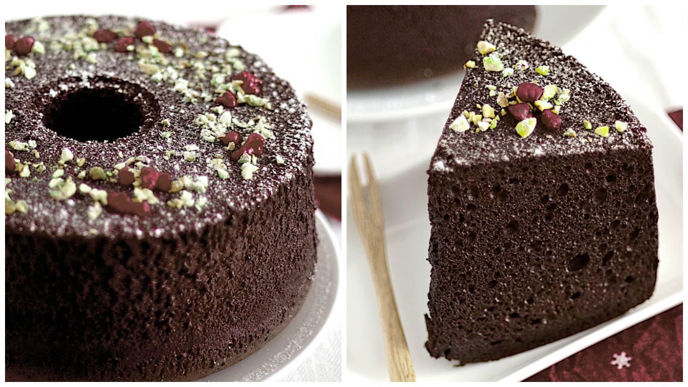 Separare gli albumi dai tuorli. Montare i tuorli con metà dello zucchero e continuando a sbattere aggiungere l'acqua, l'olio e la farina setacciata con il lievito. Montare a neve gli albumi col pizzico di sale e il resto dello zucchero e aggiungere con una spatola al composto di tuorli senza farli smontare. Sciogliere il cacao nell'acqua calda e aggiungere all'impasto. Versare in uno stampo per Chiffon Cake alto o in uno stampo per ciambellone e cuocere a 160°C per 45 minuti in forno preriscaldato. Appena sfornato capovolgere lo stampo e lasciar raffreddare avendo cura di sospenderlo su degli appoggi affinché possa arieggiare e asciugarsi. Quando la Chiffon Cake sarà totalmente fredda, staccare con cura i bordi con una spatola e lasciar scivolare sul piatto da portata. Guarnire con salsa di cioccolato o decorare a piacere.