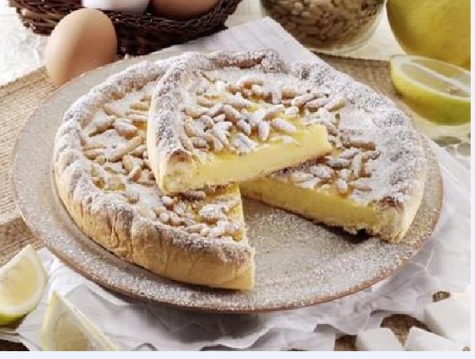 Preriscaldate il forno a 180° e imburrate uno stampo per torte. Mettete la farina su un piano e disponetela a fontana, rompete l'uovo e versatelo nel centro, mettete il burro a tocchetti ammorbiditi a temperatura ambiente, lo zucchero e la mezza bustina di lievito. Impastate la pasta frolla fino ad ottenere un composto uniforme e mettetela a riposare in frigo per almeno mezz'ora. Nel frattempo preparate la crema: versate in un pentolino i tuorli e mescolateli con lo zucchero fino a ottenere una crema chiara, aggiungete poi la farina setacciata, il latte caldo e la scorza dei due limoni. Mettete il pentolino sul fornello a fuoco medio-basso e girate continuamente fino a che la crema non si sara' addensata. Nel frattempo mettete i pinoli a bagno nell'acqua fredda. Riprendete dal frigo la pasta frolla, stendetela velocemente tra due fogli di carta da forno e ricavatene due dischi con l'aiuto del coperchio di un tegame. Adagiate il primo nello stampo e punzecchiatelo con una forchetta, togliete la scorza dei limoni dalla crema e versatela nello stampo, infine chiudete il tutto con il secondo disco di frolla. Scolate i pinoli e versateli sulla superficie della torta, infornatela per 35 minuti senza mai aprire il forno. Trascorso il tempo togliete la torta dal forno, aspettate