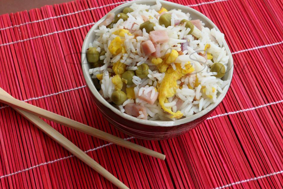 Strapazzate le uova in un wok con due cucchiai di olio di semi, facendole cuocere. Una volta pronte trasferitele in un piatto e spezzettatele finemente con una forchetta. Ponete in una pentola due cucchiai di olio e fatevi saltare il prosciutto a cubetti e i piselli con un pizzico di sale per 2 minuti. Quando il riso sarà al dente, scolatelo e mettelo da parte