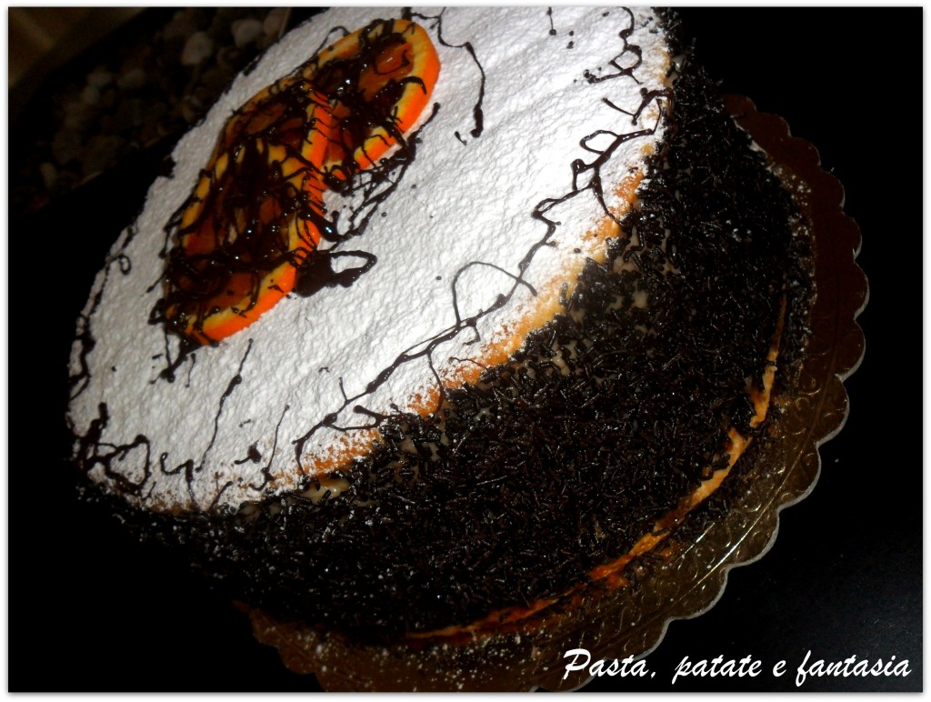 Coprire con un altro disco, bagnarlo e coprire con un altro strato di crema pasticcera e gocce di cioccolato. Coprire con l'ultimo disco, bagnarlo e coprirlo con un altro strato di crema all'arancia, conservandone un cucchiaio. Ricoprire con l'altro disco di sfoglia. Unire la pasticcera avanzata alla crema all'arancia e pareggiare benissimo i bordi. Ricoprire tutto il laterale con le codette e spolverizzare con abbondante zucchero a velo la superficie. Decorare in fine con fettine di arancia e cioccolato fuso.