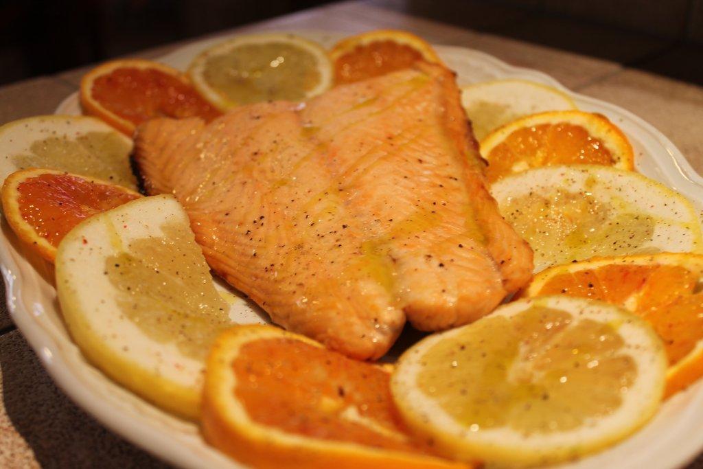 - 4 tranci di salmone,1 limone, 1 arancio, salsa di soia q.b.,