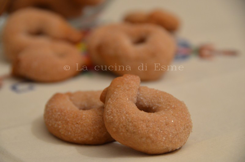 In una grande ciotola versare lo zucchero, il vino e l'olio, mescolare bene con una forchetta o una frusta a mano e poi iniziate ad aggiungere, poco per volta, la farina setacciata sempre mescolando. Verso la fine aggiungete un cucchiaino di lievito. Ad un certo punto non riuscirete più ad andare avanti con la frusta, sarà allora arrivato il momento di cominciate ad impastare a mano, seguitate ada ggiungere la farina fino ad ottenere una consistenza simile a quella degli gnocchi di patata. Ma attente l’impasto non deve diventare duro. Regolatevi ad occhio con la quantità di farina da utilizzare. Quando l'impasto sarà pronto, staccatene dei piccoli pezzetti e formate dei cordoncini corti che poi unirete per dare la forma della ciambellina. Ogni ciambellina dovrà essere passata nello zucchero semolato, ma solo da una parte. Adagiatele su una teglia foderata di carta forno con la parte zuccherata verso l’alto. Infornate a 180° per circa 25 minuti. Non devono risultare troppo dorate.