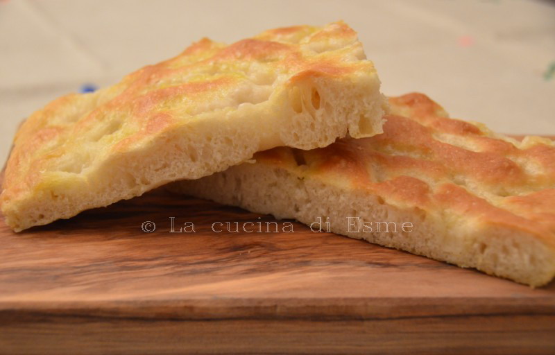 In una ciotola mescolate le due farine e il sale, fate la buca e versate al centro l'olio e l'acqua tiepida in cui avrete fatto sciogliere il lievito di birra. Mescolate bene semplicemente con un cucchiaio e assolutamente non impastate. Ungete la superficie dell'impasto con poco olio evo, coprite con un panno di cotone e lasciate riposare per 10 minuti. Foderate con carta forno una teglia da forno ( la mia 33x33) ungete leggermente anche la carta con dell'olio e, passato il tempo, appoggiatevi sopra l'impasto, così com’è senza maneggiarlo solo sottosopra, cioè mettete a contatto della teglia la parte che in precedenza avete oliato e ungete con altro olio la parte rivolta verso di voi. Coprite con della carta forno e con un panno di cotone. Lasciare nuovamente riposare per altri 10 minuti. Ora con la punta delle dita e partendo dal centro, stendere l'impasto senza premere troppo in modo da non rompere le bolle d'aria che si stanno formando, coprite nuovamente con la carta forno e con il panno di cotone (se fosse una giornata particolarmente fredda a questo punto mantenete la teglia al caldo magari copritela con una coperta). Lasciate riposare per 20minuti. Nel frattempo preparate l’emulsione mescolando molto bene tutti gli ingredienti con una forchetta, fino ad ottenere una salsa omogenea. Riprendete la pasta e con la punta delle dita formare tante fossette. Rimescolare l’emulsione e versatela tutta sulla focaccia (non è troppa, fidatevi) lasciate riposare ancora per 20 minuti ( io la lascio 30min). Accendete il forno a 220°. Infornate (io una tacca più in basso della metà del forno) per 30 minuti. Sfornatela ponetela su una griglia per 5 minuti, tagliatela a fette e servitela per accompagnare salumi e formaggi.