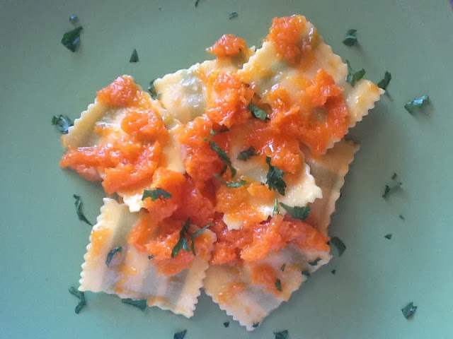 Ho cotto i ravioli in acqua salata, non appena pronti li ho impiattati e conditi con la salsa di zucca.