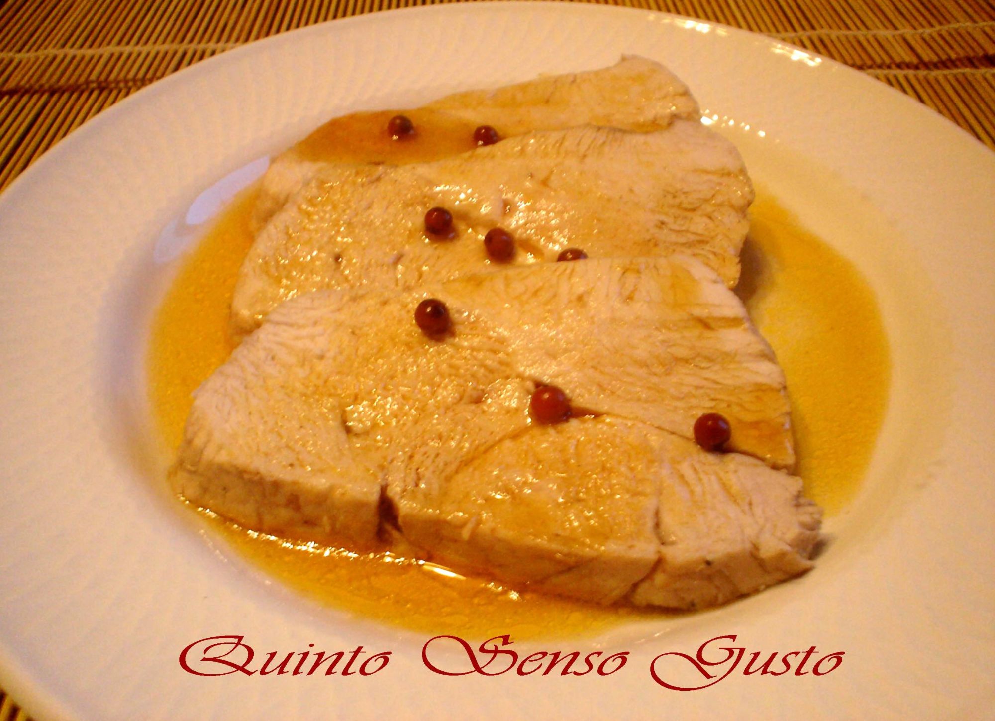 Togliere i rametti di rosmarino dal fondo di cottura e insaporire con il pepe, se occorre regolare di sale. Se il fondo di cottura dovesse risultare troppo liquido, farlo restringere a fuoco vivo per formare il sughetto. Togliere la carta stagnola e tagliare la fesa a fette non troppo sottili, sistemarle su di un piatto da portata e versavi sopra il sughetto .