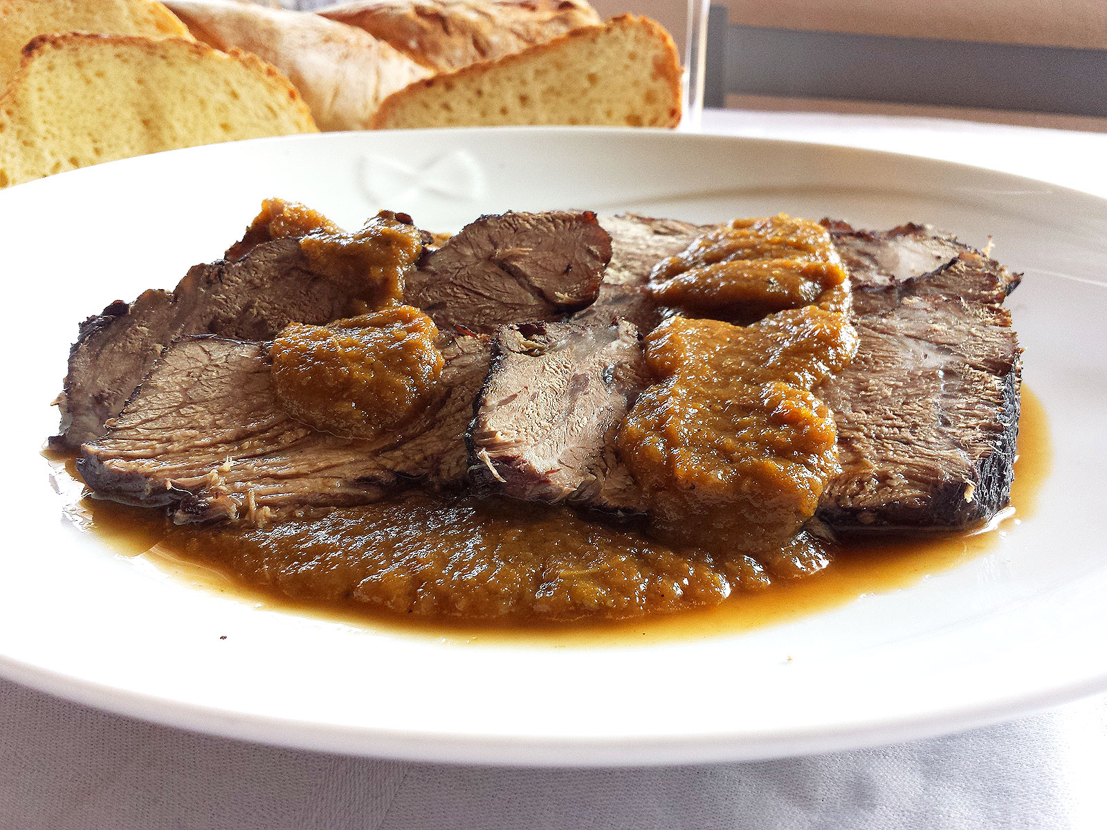 Tagliate il brasato a fettine ed impiattate cospargendo con la salsetta ottenuta.