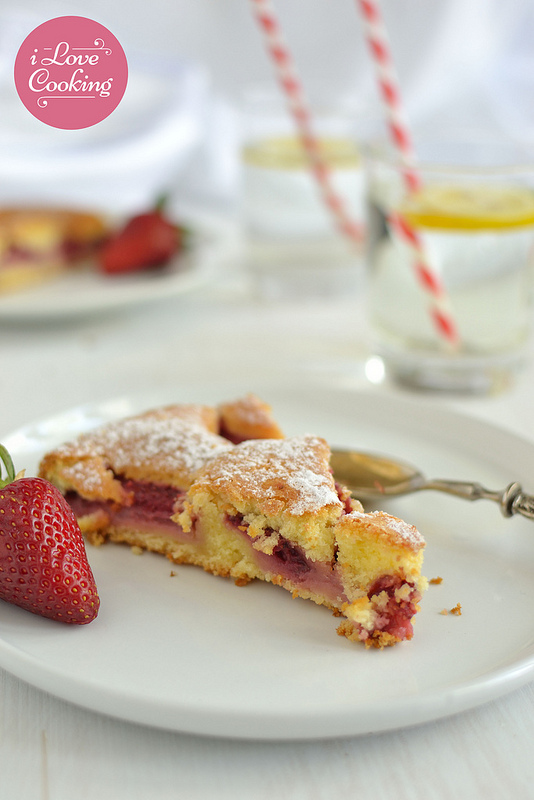 Versare l’impasto nella teglia imburrata. Disporre le fragole sull’impasto posizionandole con il lato tagliato verso il basso e coprendo tutta la superficie della torta. Distribuire 2 cucchiai di zucchero sulla torta ed infornare a 175°C per 10-15 minuti. Abbassare la temperatura a 150°C e proseguire la cottura per altri 25-30 minuti circa o fino a che uno stecchino infilato nel centro della torta risulti asciutto.
