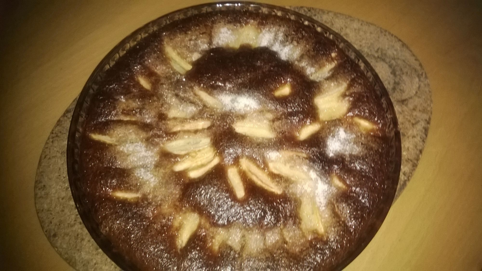Tagliate una mela a fettine sottili e aggiungetela all'impasto. Versate il composto in uno stampo imburrato e infarinato. Distribuite sopra le fettine di mela e aggiungete una spolverata di zucchero.