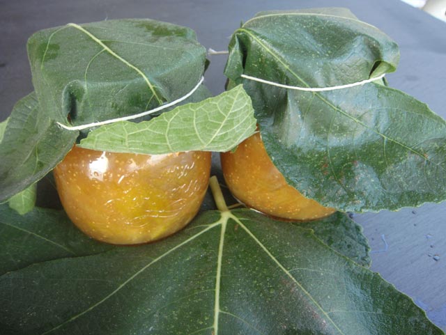 Bollite per 10 minuti la polpa con le scorzette e lo zucchero. Aggiungete i fichi tagliati a pezzettini e fate cuocere fino a che il composto sarà della giusta consistenza per essere invasato. Versate nei barattoli sterilizzati, capovolgeteli e fateli raffreddare, possibilmente coperti da una coperta di lana per evitare lo sbalzo di temperatura. Dose per 2 barattoli da mezzo Kg l'uno.